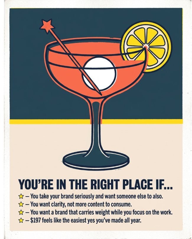 The Brand Bar runs on a combination of my Signature Brand framework, trained AI bartenders, and my brand judgment. You start by creating a living brand profile. From there, the system reviews how your brand is showing up across your public touchpoints and turns those signals into focused monthly Brand Recipes. I oversee the system and the structure so the guidance stays intentional, useful, and on brand.